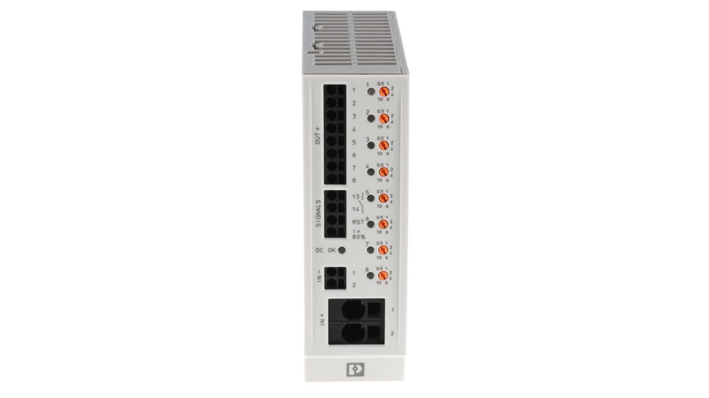 Interruttore di sicurezza elettronico Phoenix Contact, 10A, 24V, montaggio guida DIN. Capacità di commutazione a cortocircuito 300 A, 8 canali, regolazione corrente 0,5-10A. Grado di protezione IP20, umidità operativa massima 95% a 40 gradi, resistenza agli urti secondo EN 60068-2. Dimensioni 130mm x 41mm x 121mm. Certificazione EN 61000-6 per riduzione EMI. Codice costruttore 2905744.
