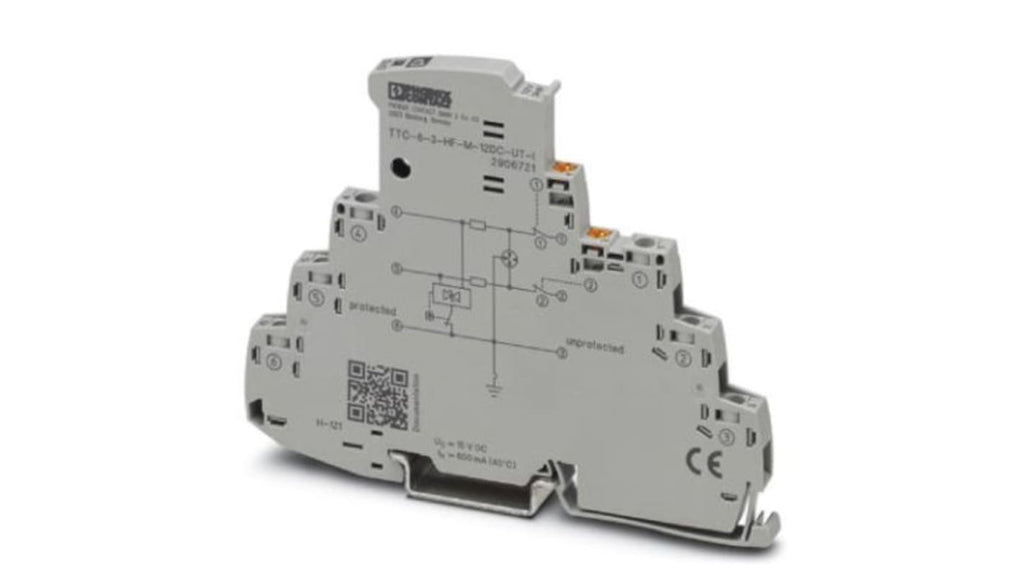 Dispositivo di protezione contro le sovracorrenti per guida DIN, corrente massima di sovraccarico 20kA, corrente di scarica 0.5kA, gamma di temperatura operativa da -40 a +80 gradi Celsius, messa a terra con schermatura isolata, sostituzione senza errori dei tappi di protezione, segnalazione senza alimentazione ausiliaria, marca Phoenix Contact, serie TTC.