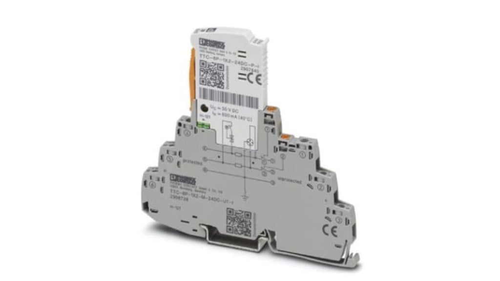 Dispositivo di protezione contro le sovracorrenti per guida DIN, corrente massima di sovraccarico 20kA, corrente di scarica 0.5kA, gamma di temperatura operativa da -40 a +80 gradi Celsius, messa a terra con schermatura isolata, sostituzione senza errori dei tappi di protezione, indicatore di stato meccanico, marca Phoenix Contact, codice costruttore 2906738, serie TTC.