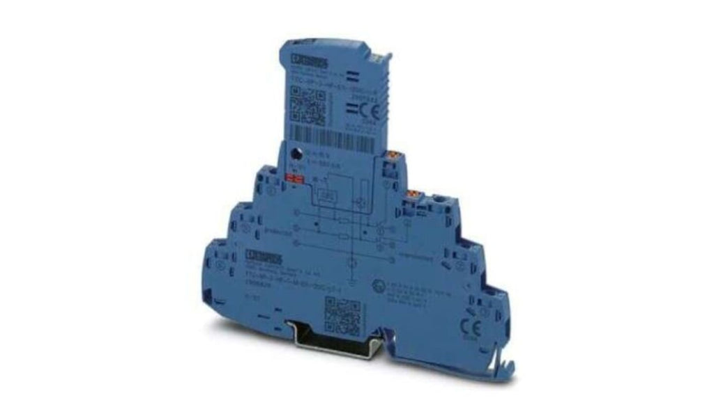 Dispositivo di protezione contro le sovracorrenti per guida DIN. Marchio Phoenix Contact, codice 2906826. Corrente di scarica 0.5 kA, gamma di temperatura operativa da -40 a +80 gradi Celsius. Messa a terra con schermatura isolata, segnalazione senza alimentazione ausiliaria, sostituzione senza errori dei tappi di protezione, salvaspazio. Serie TTC.