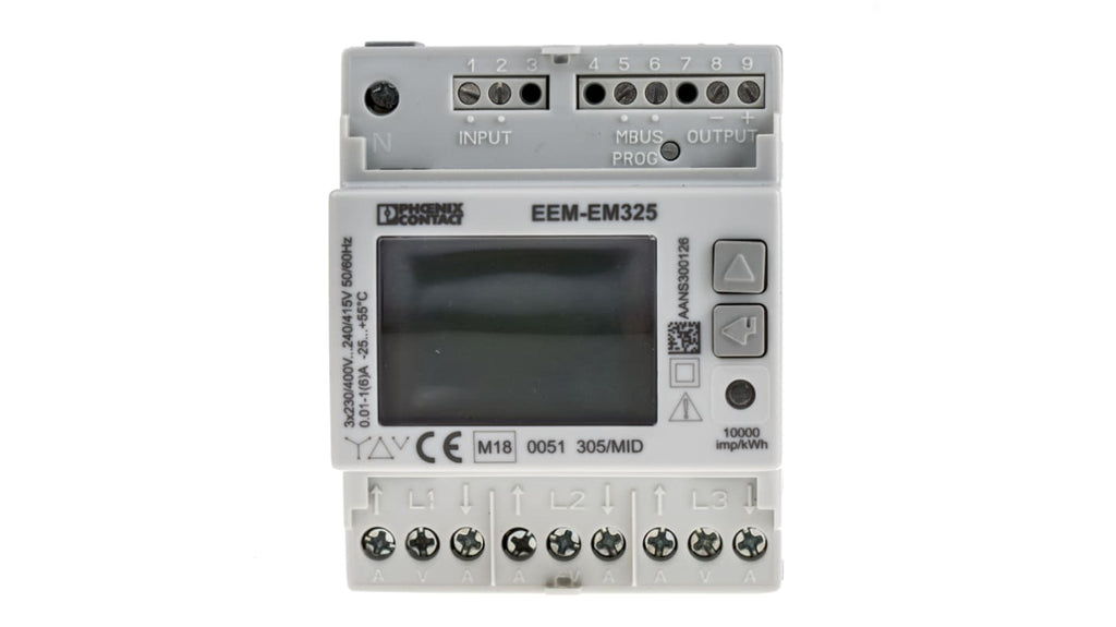 Contatore di energia trifase Phoenix Contact, modello EMpro, display digitale a 8 cifre, misurazione diretta fino a 1A/5A/500V, uscita S0, ingresso digitale, interfaccia MBUS. Grado di protezione IP 51 (anteriore), IP 20 (connessioni), umidità relativa operativa massima 80%, temperatura operativa da -25 a +55 gradi Celsius. Certificazioni: direttiva MID, approvato eac, conforme a EN 50470-3, IEC 62053-21, IEC 62053-23.