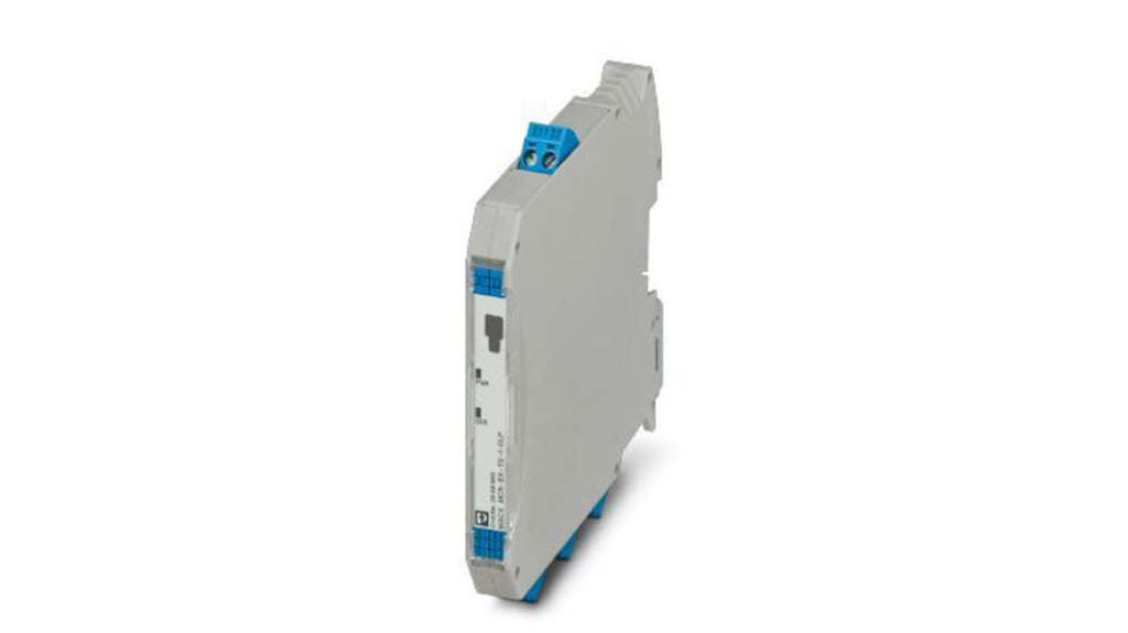 Condizionatore di segnale per applicazioni industriali, convertitore di temperatura, ingresso per RTD, potenziometro, termocoppia e tensione, uscita corrente 4-20 mA, gamma di ingresso 0-50 kΩ, -250-2500 °C, -1000-1000 mV, alimentazione 12-42 V, certificazione ATEX, montaggio su guida DIN, temperatura operativa -40-85 °C, terminazione a vite, serie MACX MCR.