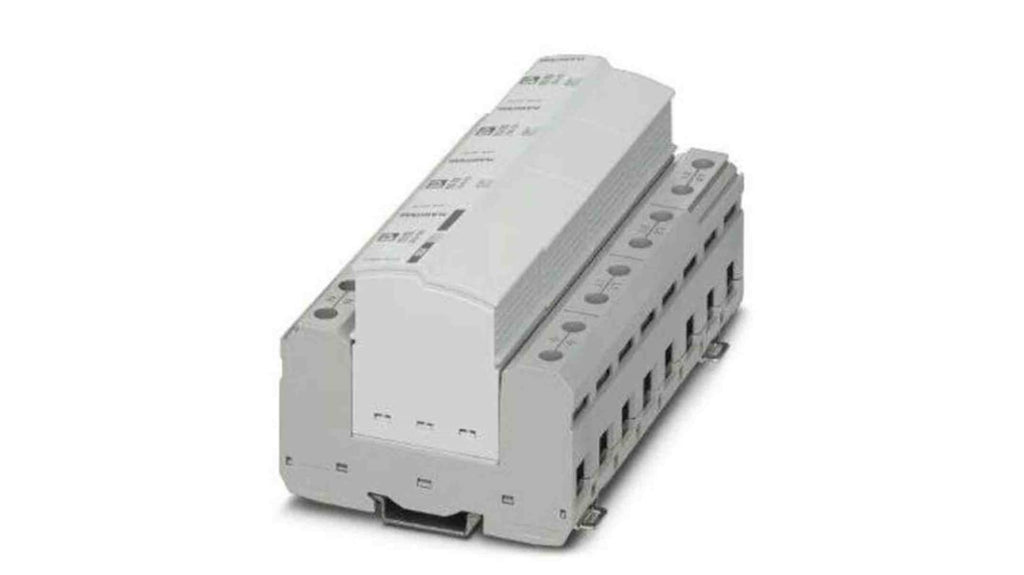 Limitatore di sovracorrente trifase per guida DIN. Corrente massima di sovraccarico 50kA, tensione nominale 230/400 V c.a. Classificazione IEC i+II, T1+T2. Modalità di protezione L-PEN, L-N e N-PE. Dimensioni 47mm di larghezza, montaggio su guida DIN 40mm. Materiale PA 6.6. Progettato per reti di alimentazione trifase con N e PE combinato. Codice costruttore 2909589, marchio Phoenix Contact.
