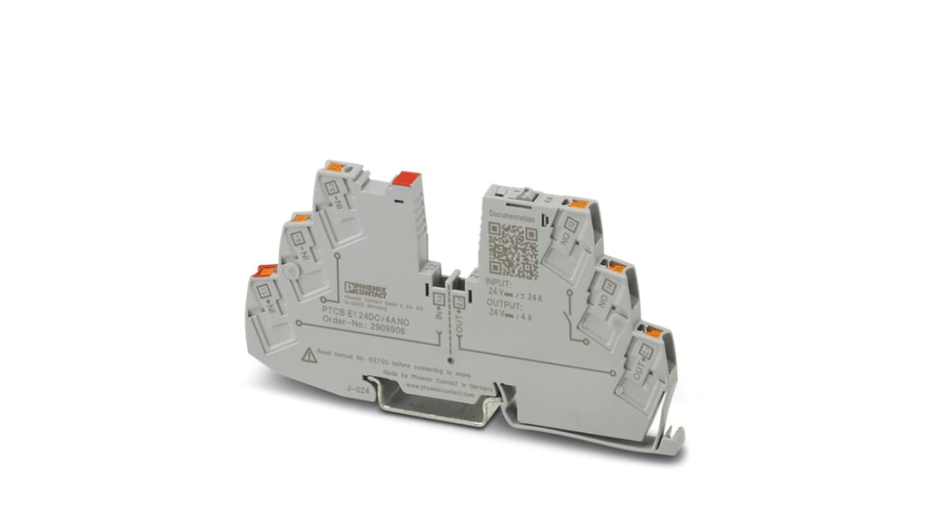 Interruttore di sicurezza elettronico a canale singolo, corrente nominale 4 A, tensione 24 V c.c., montaggio su guida DIN, grado di protezione IP20, temperatura ambiente da -30 a 60 gradi. Progettato per proteggere i carichi da sovraccarichi e cortocircuiti. Non fa parte della gamma "complete Line" di Phoenix Contact. Codice costruttore 2909906.