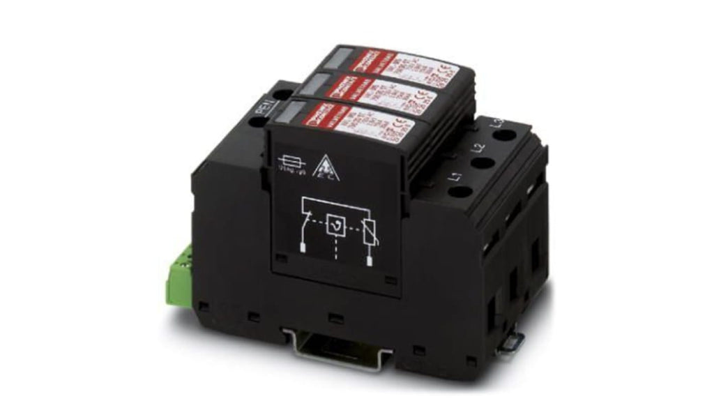 Scaricatore di sovratensione tre fasi, max 30kA, tensione nominale di protezione 2,9kV, montaggio su guida DIN, categoria di sovratensione III, grado di inquinamento 2, frequenza nominale 50 Hz, contatto indicatore di guasto remoto, compatibile con sistemi di alimentazione a 4 conduttori, testato per applicazioni industriali e generatori di turbine eoliche, conforme a IEC II e EN tipo T2.