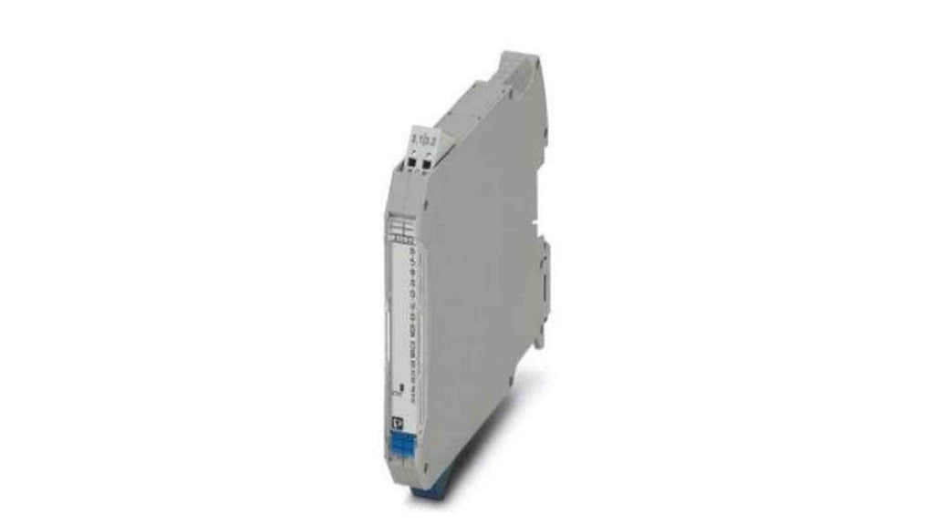 Driver per solenoide per controllo a sicurezza intrinseca, compatibile con valvole a solenoide standard, limitazione di corrente 48mA, tensione di ingresso 19.2-30V cc, uscita 10.5V cc, resistenza 275.7Ω, isolamento elettrico a 2 vie, certificazione ATEX e IECEx, montaggio su guida DIN, serie MACX MCR. Non parte della gamma "complete Line" di Phoenix Contact.