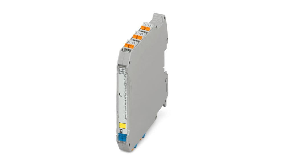 Condizionatore di segnale per trasduttori di misurazione ex i, HART-trasparente, isolamento elettrico a 4 vie, collegamento a innesto, SIL, PL. Gamma di ingresso 4-20 mA, gamma di uscita 4-20 mA, tensione di alimentazione 19.2-30V cc, certificazione ATEX e IECEx, temperatura di esercizio -20-60°C. Serie MACX MCR, codice costruttore 2924236.