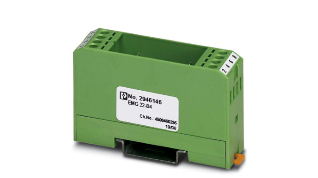 Contenitore elettronico professionale per modulo circuito personalizzato, serie EMG 22-B4, marchio Phoenix Contact. Montaggio rapido e sicuro su guida DIN standard da 35 mm, colore verde. Accessorio progettato per utilizzo con modulo relè a stato solido. Disponibile in varie posizioni.