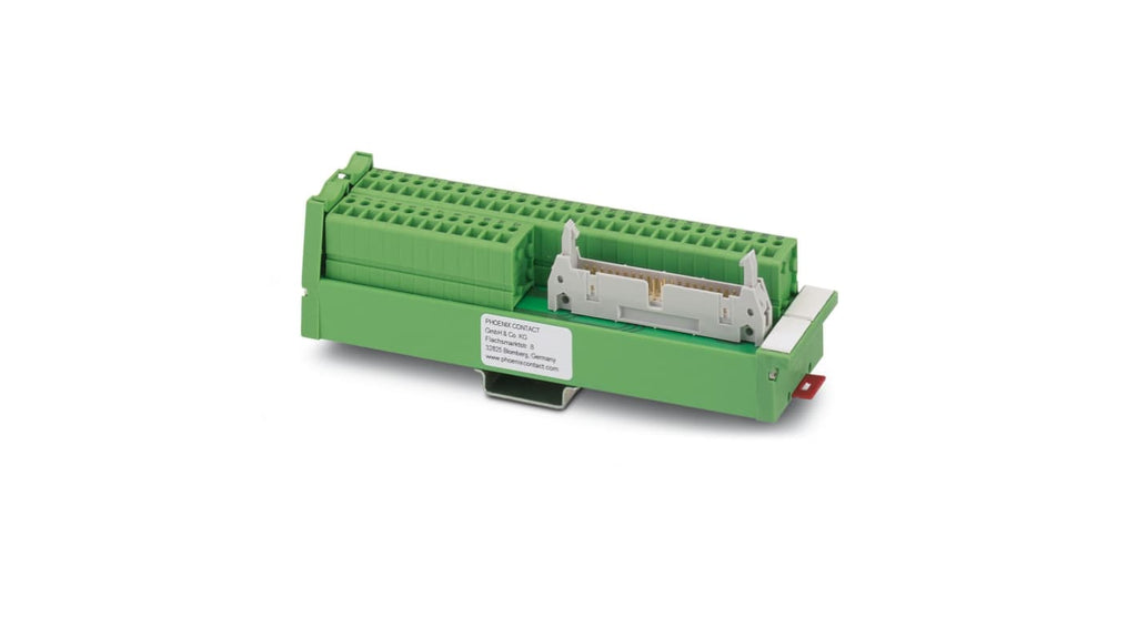 Modulo Varioface per guida DIN, serie VARIOFACE, collegamento a vite, connettore per cavo a nastro piatto, montaggio ad angolo retto su NS 35/7,5, 40 posizioni, massima temperatura operativa +50°C, dimensioni 45 x 45 x 167 mm. Marchio Phoenix Contact, codice costruttore 2959544.