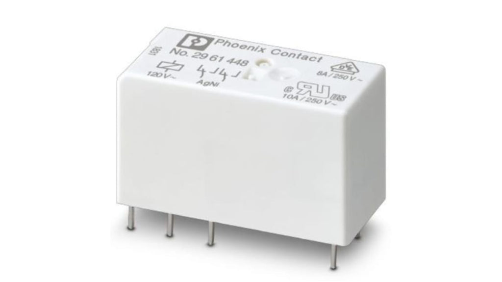 Relè di potenza miniaturizzato a innesto per guida DIN, tensione di ingresso 120 V c.a., 2 contatti di potenza PDT, corrente di commutazione 10 A, resistenza bobina 8100 ohm ±15%, potenza bobina 840 mW, serie REL-MR-120AC/21-21, marchio Phoenix Contact, codice costruttore 2961448.