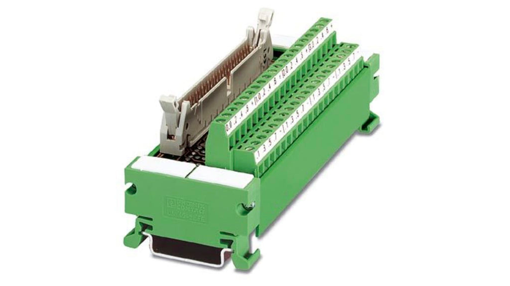 Modulo passivo Varioface a 32 canali, collegamento diretto delle linee di segnale di attuatori o sensori, connettore maschio conforme a IEC 603 1/DIN 41 651, morsetto a vite per collegamenti, portaetichette per identificazione, montaggio su guida DIN. Marchio Phoenix Contact, serie UM 45-FLK50/PLC, codice costruttore 2962489.