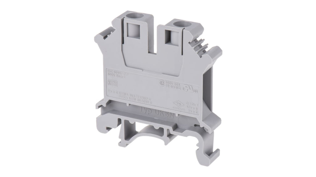 Morsettiera per guida DIN, livello singolo, corrente nominale 41A, tensione nominale 800V, terminali universali a vite, materiale isolante in poliammide, dimensioni conduttori da 2,5 mm² a 35 mm², utilizzo in aree con atmosfere esplosive, certificazione ATEX, temperatura operativa da -60°C a +105°C, conforme a RoHS e standard IEC 60947-7-1. Colore grigio, modello UK 6 N.