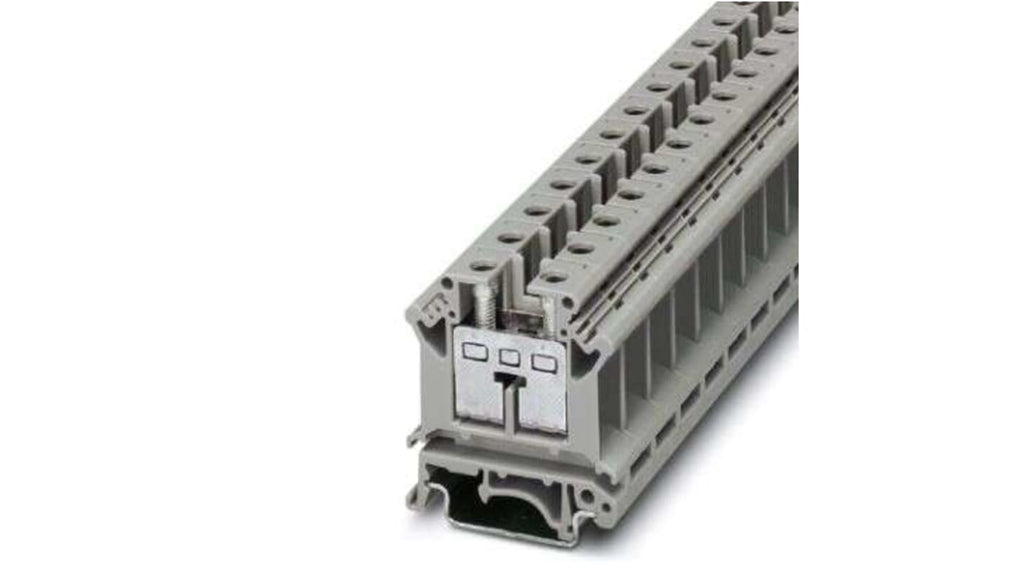 Morsetto di installazione Phoenix Contact, tensione nominale 400 V, corrente nominale 76 A, terminazione a vite, sezione nominale 16 mm², larghezza 12,2 mm, lunghezza 42,5 mm, colore grigio, materiale isolante PA, disposizione asimmetrica per barra di distribuzione neutra.