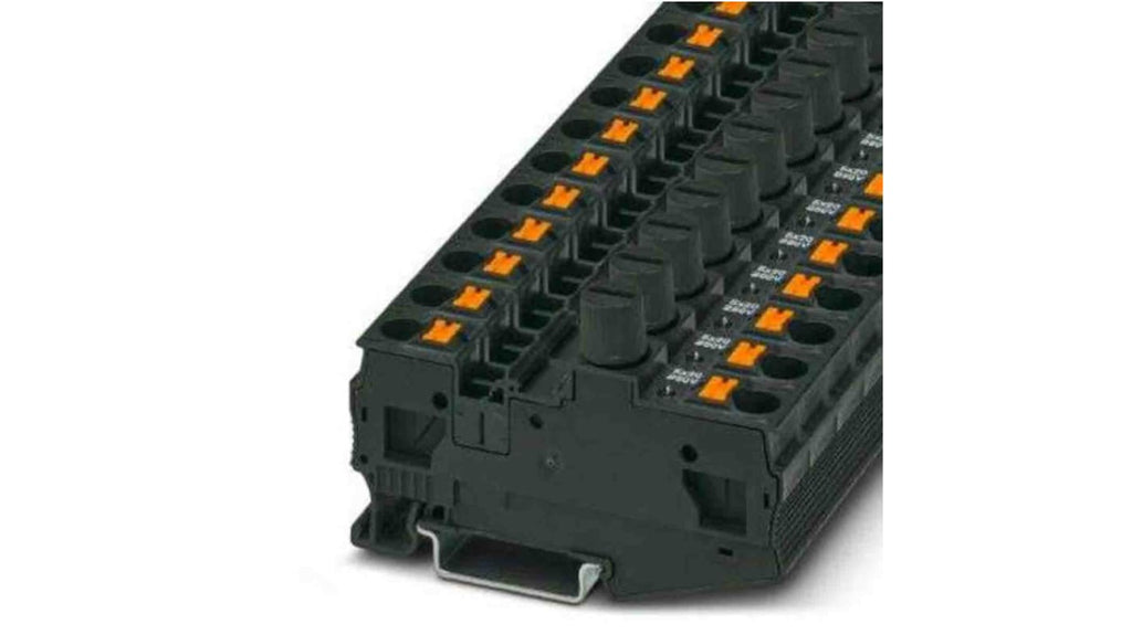 Morsettiera modulare con fusibili, Phoenix Contact, colore nero, livello singolo, corrente nominale 10A, metodo di collegamento a innesto, 2 collegamenti, fusibile in vetro o ceramica, 24 LED per tensione, temperatura d'esercizio da -60 a 85 gradi Celsius, materiale isolante PA, grado di infiammabilità UL 94 V0, categoria di sovratensione III. Non parte della gamma "complete Line".