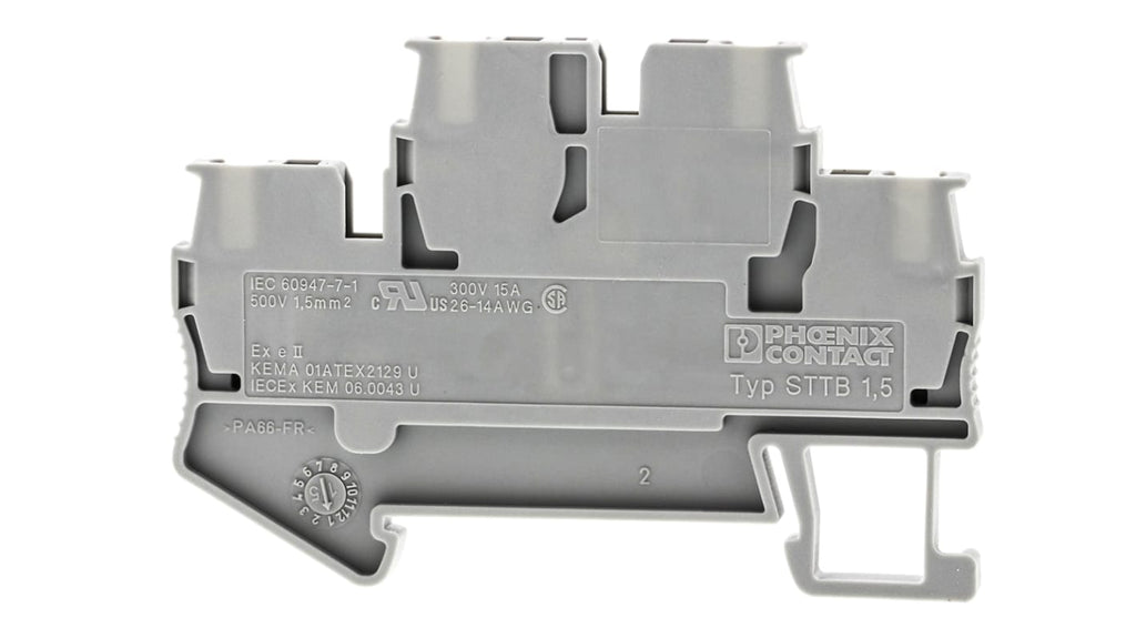 Morsettiera a doppio livello per guida DIN, corrente nominale 17.5A, tensione nominale 500V, compatibile con cavi AWG 28-16 e sezioni da 0.08 a 1.5mm². Colore grigio, realizzata in poliammide, contatti in rame placcato. Montaggio su guide DIN NS 35/7.5 e NS 35/15. Certificazione ATEX EX per aree potenzialmente esplosive. Modello STTB 1.5.