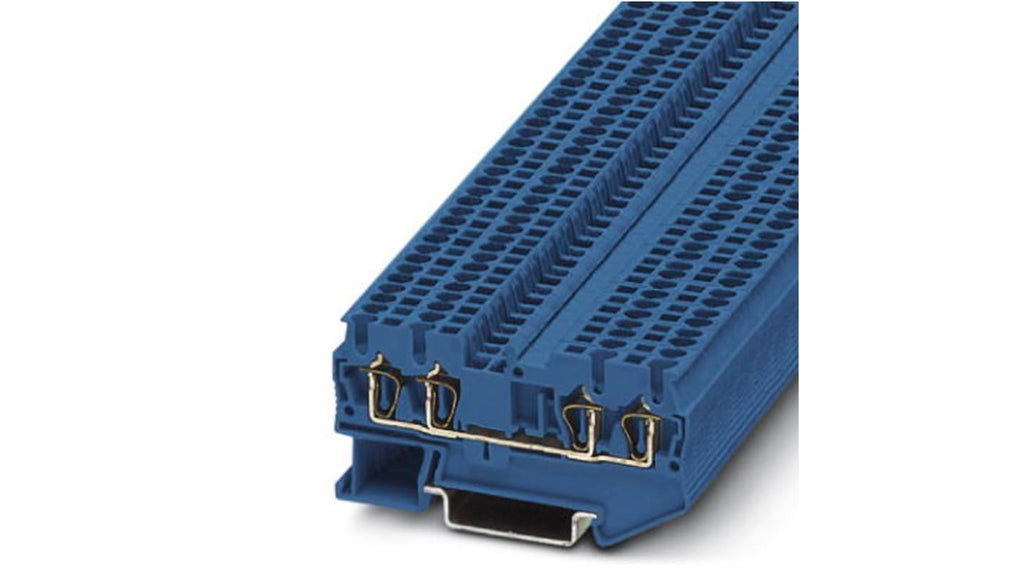Morsettiera passante per collegamenti elettrici, terminali a molla a quattro fili, colore blu, livello singolo, corrente nominale 17.5A, tensione nominale 500V, compatibile con cavi da 28 a 16 AWG, sezione cavo 1.5mm², utilizzo come distributore di potenza compatto, omologazioni UL/CUL, modello ST 1.5-QUATTRO BU.