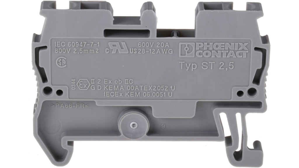 Morsettiera passante Phoenix Contact, colore grigio, livello singolo, corrente nominale 24 A, tensione nominale 800 V, compatibile con cavi da 28 a 12 AWG, montaggio su guida DIN, materiale in poliammide, temperatura operativa da -50 a +110 gradi Celsius, bassa resistenza di contatto 1,04 mΩ, certificazione ATEX per ambienti esplosivi, progettata per applicazioni industriali e ferroviarie. Codice costruttore 3031212.
