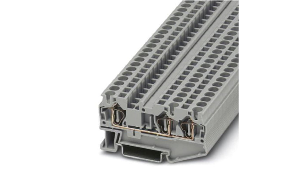 Morsettiera passante per guida DIN, modello ST 1.5-TWIN, colore grigio, corrente nominale 40A, tensione nominale 800V, AWG 28-10, installazione senza utensili, design salvaspazio per collegamenti multiconduttore, realizzata in poliammide resistente, compatibile con guide NS 35/7.5 e NS 35/15, grado di protezione ATEX EX, conforme a standard UL e CUL. Codice costruttore 3031393, marchio Phoenix Contact.