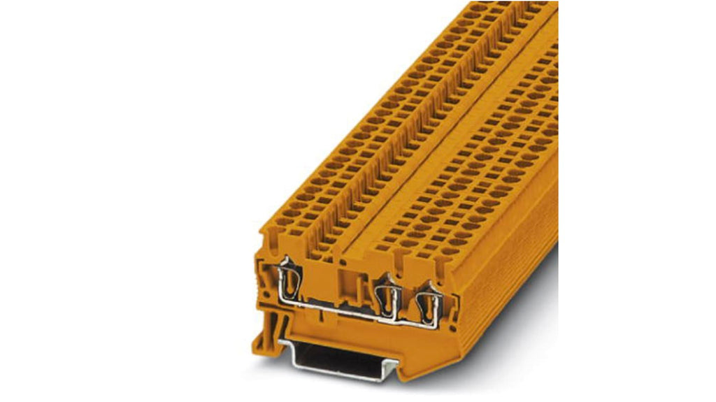 Morsettiera passante per guida DIN, modello ST 1.5-TWIN, Phoenix Contact. Colore arancione, livello singolo, corrente nominale 24A, tensione nominale 800V. Collegamento a molla, installazione senza utensili. Dimensioni 4,2 mm di larghezza, compatibile con sezioni di cavo da 0,8 mm² a 1,5 mm². Realizzata in poliammide resistente, grado di protezione ATEX EX per ambienti esplosivi. Certificazioni UL e CUL.