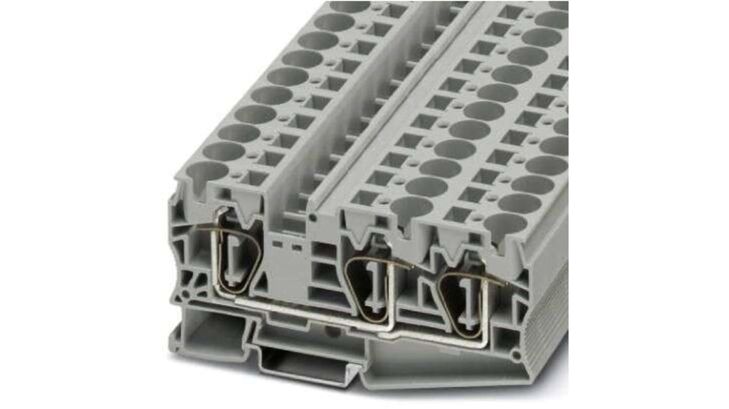 Morsettiera passante Phoenix Contact, serie ST 16-TWIN, colore grigio, con collegamento a gabbia a molla. Sezione nominale 16 mm², corrente nominale 76A, tensione nominale 1 kV, temperatura operativa da -60 a 85 gradi Celsius. Terminale innestabile, compatibile con cavi fino a 25 mm². AWG 4. Modello 3035328.