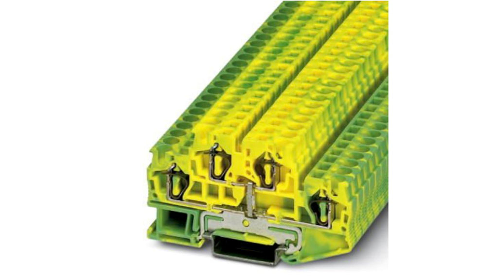 Morsettiera passante per guida DIN con gabbia a molla, doppio livello, colore verde/giallo. Serie STTB 4-PE, compatibile con cavi da 0.08 a 6 mm² e AWG 28-10. Montaggio su guide DIN NS 35/7.5 e NS 35/15. Grado di protezione ATEX EX per installazioni in aree potenzialmente esplosive. Contatti in rame placcato, contenitore in poliammide. Certificazioni UL, CUL, CSA.