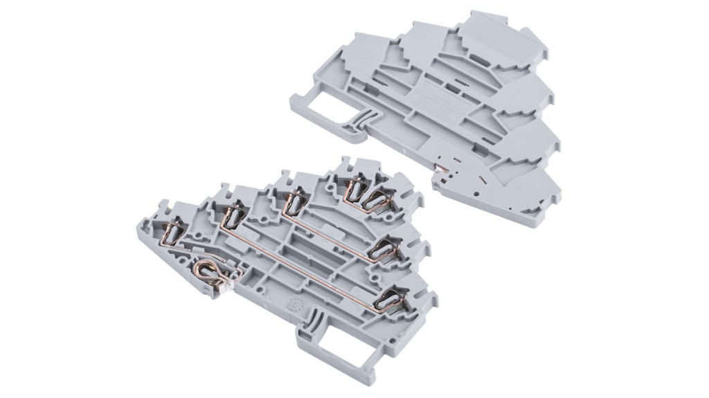 Morsettiera per guida DIN, livello quadruplo, corrente nominale 20A, tensione nominale 800V, accetta cavi da 28 a 12 AWG, sezione da 0,08 a 3,32 mm², terminazione a morsetto a molla, materiale contenitore in poliammide, temperatura operativa da -50 a +110 gradi Celsius, colore grigio, serie ST 2.5-PE/3L. Certificato No.KEMA 00ATEX2052 UGroup and Category II 2 G D Ex e II.