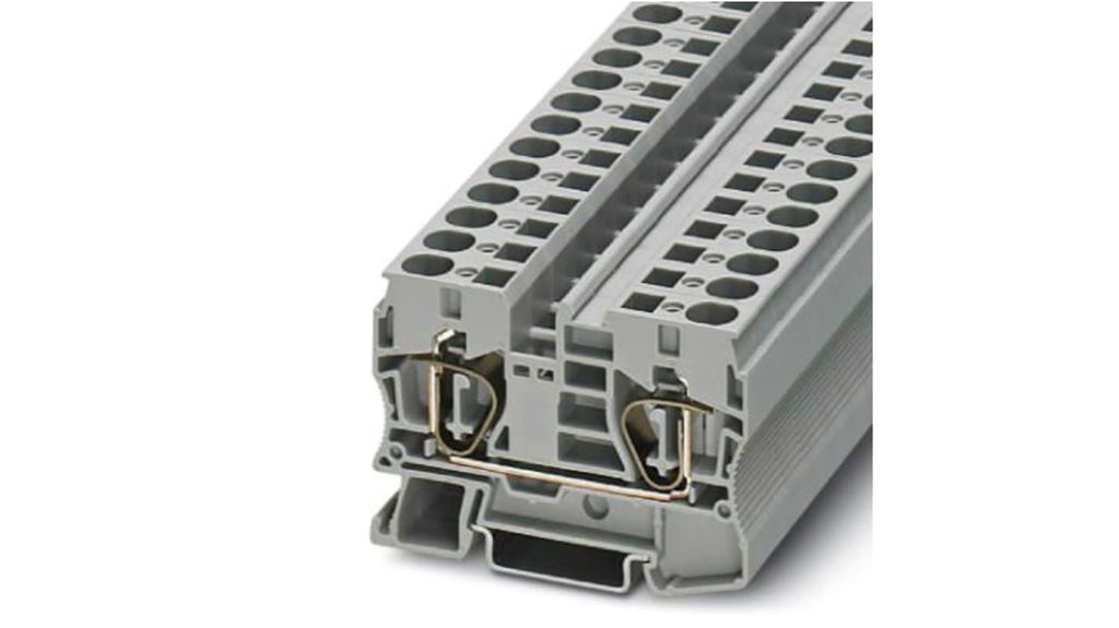 Morsettiera passante per guida DIN, modello ST 10, Phoenix Contact. Colore grigio, corrente nominale 65 A, tensione nominale 800 V. Collegamento a gabbia a molla, compatibile con cavi da 1.5 a 16 mm². Progettata per montaggio su guide DIN NS 35/7.5 e NS 35/15. Realizzata in poliammide, temperatura di esercizio da -60 a 85 gradi Celsius. Certificata UL e CUL.