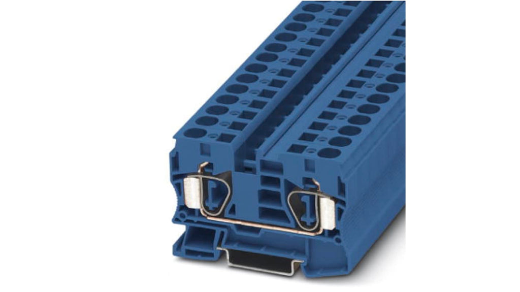 Morsettiera passante per guida DIN, modello ST 10 BU, colore blu, livello singolo, corrente nominale 57 A, tensione nominale 1 kV, terminazione a morsetto a molla, accetta cavi da 1.5 a 16 mm² e da 24 a 6 AWG, progettata per montaggio su guide DIN NS 35/7.5 e NS 35/15, realizzata in poliammide, temperatura di esercizio da -60 a 85 gradi Celsius.