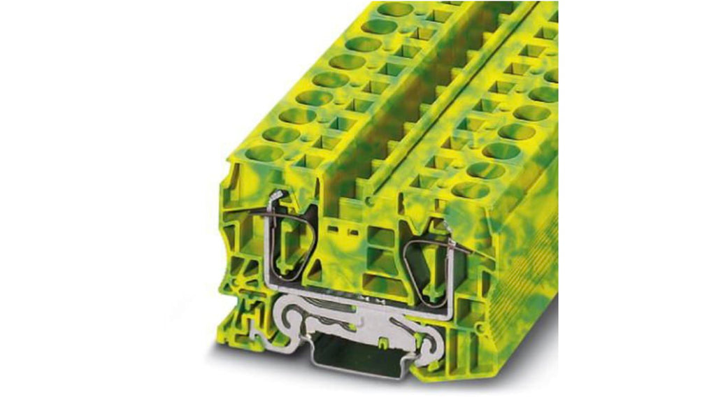 Morsettiera di terra Phoenix Contact, Verde/Giallo, 90A. Corrente nominale 90A, tensione nominale 400V, compatibile con guide DIN NS 35/7.5 e NS 35/15. Accetta cavi da 28 a 10 AWG e 0,08 mm² - 6 mm². Realizzata in poliammide, contatti in rame. Temperature d'esercizio da -60 °C a 85 °C. Include fusibile piatto per maggiore protezione. Certificata KEMA 00ATEX2052. Codice costruttore 3036165.