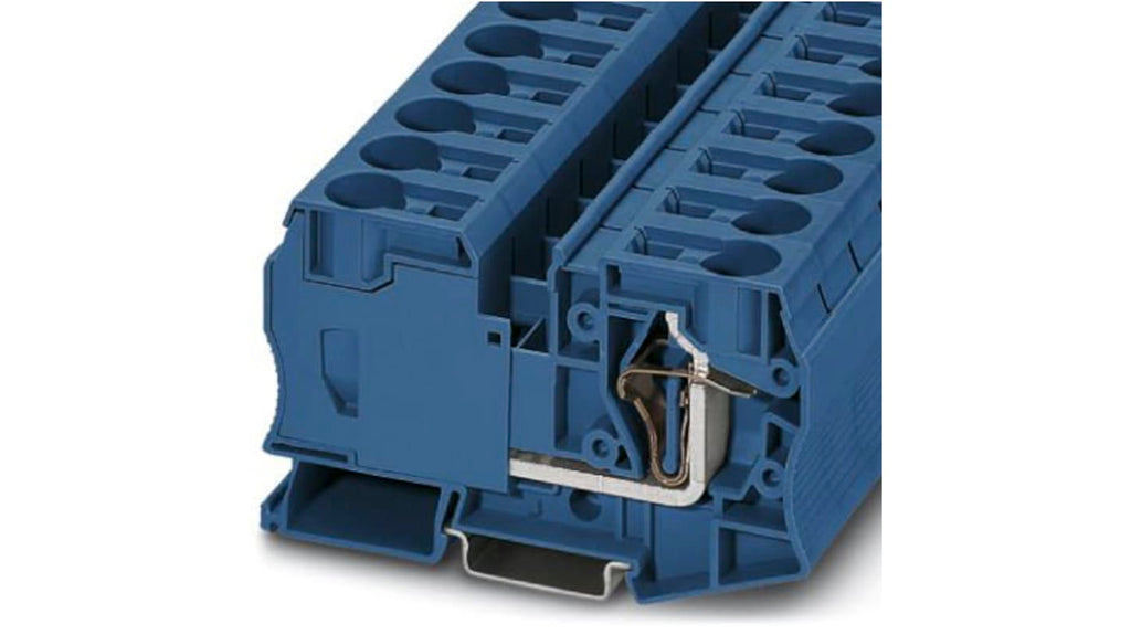 Morsettiera passante per guida DIN, livello singolo, corrente nominale 125A, tensione nominale 1 kV, colore blu. Tecnologia a gabbia a molla per connessione rapida, accetta cavi da 2.5 a 35 mm², compatibile con guide DIN NS 35/7.5 e NS 35/15. Temperature di esercizio da -60 a 85 gradi Celsius. Certificata secondo norme KEMA e UL. Codice costruttore 3036181, marchio Phoenix Contact.