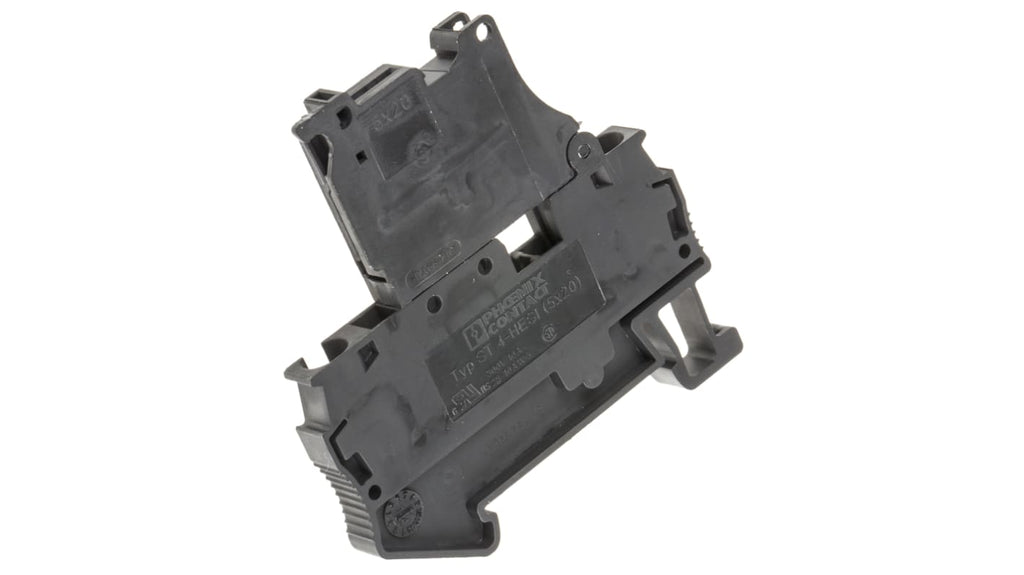 Terminale per guida DIN con fusibile, corrente nominale 6,3 A, tensione nominale 500 V, fusibile standard a cartuccia in vetro 5 x 20, montaggio frontale, larghezza 6,2 mm, lunghezza 61,5 mm, temperatura operativa -60°C a +85°C, accetta fili da 28 a 10 AWG, morsetto a molla, alloggiamento in poliammide, conforme a cULus, progettato per livelli di pericolo uno a tre secondo EN 45545-2. Colore nero, modello ST 4-HESI.