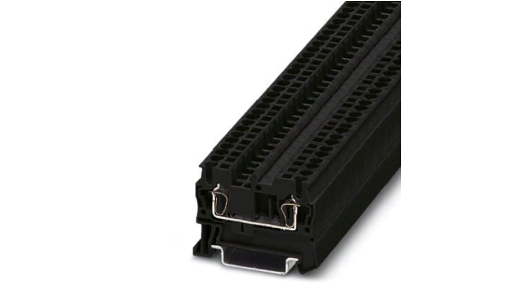 Morsettiera passante per guida DIN, livello singolo, corrente nominale 24A, tensione nominale 800V, colore nero. Realizzata in poliammide resistente, con contatti in rame. Accetta cavi da 28 a 12 AWG, sezione da 0,08 mm² a 6 mm². Dotata di gabbia a molla per un collegamento sicuro e fusibile piatto per maggiore protezione. Temperature d'esercizio da -60 °C a 85 °C. Compatibile con guide DIN NS 35/7.5 e NS 35/15. Codice costruttore 3037122.