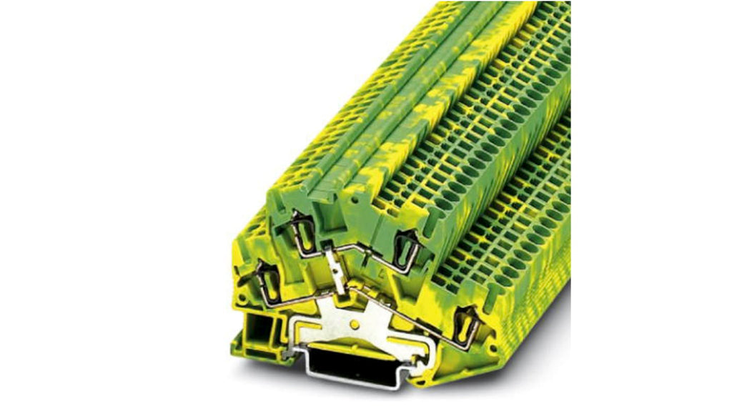 Morsettiera per guida DIN, doppio livello, colore verde/giallo, serie TB. Modello STTBS 2,5-PE, compatibile con cavi AWG 28 a 12. Terminazione a morsetto a molla. Prodotto da Phoenix Contact, codice costruttore 3038480.