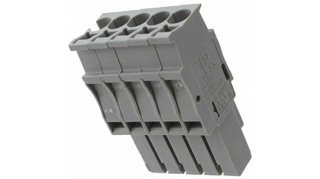 Connettore maschio COMBI Phoenix Contact, serie SP 2.5/5, morsettiera a innesto, terminazione con gabbia a molla, corrente nominale 24A, tensione nominale 500V, dimensione cavo 0.08 a 4 mm², materiale poliammide, colore grigio. Compatibile con tecnologia di collegamento a vite, a pressione e connessione veloce.