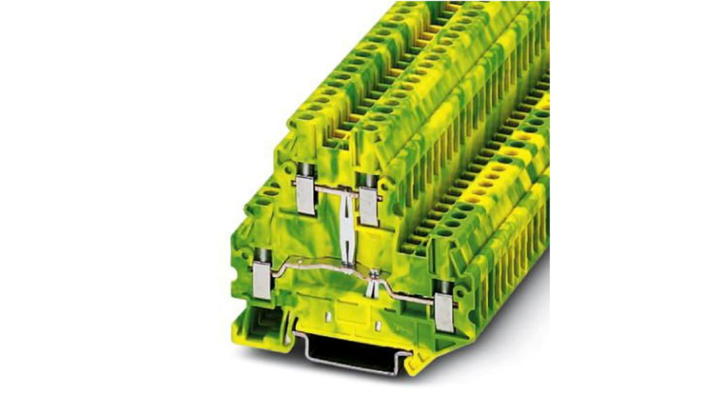 Morsettiera a doppio livello per guida DIN, Phoenix Contact, colore verde e giallo, modello UTTB 2,5-PE, collegamento a vite, conduttore CSA da 0,14 a 2,5 mm², AWG 26 a 12, tensione nominale 352 V, temperatura operativa da -60 a +105 gradi, conforme a standard CSA, ATEX e IECEx, flangia a vite UTTB inserita sulla guida DIN, dimensioni compatte di 5,2 mm.
