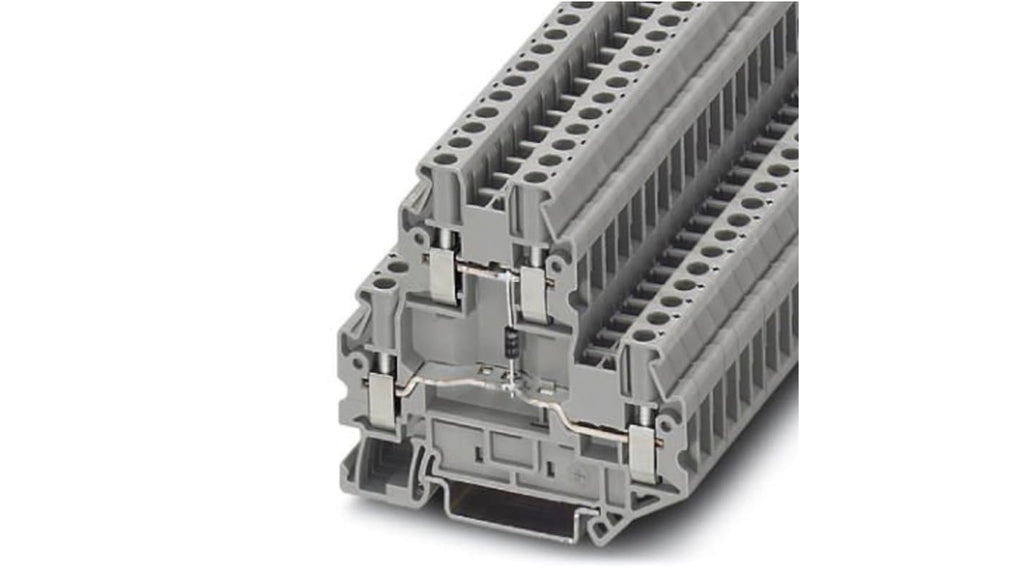 Morsettiera per guida DIN, livello doppio, corrente nominale 28A, tensione nominale 500 V, terminazione a vite, colore grigio. Modello UTTB 2.5-DIO/U-O, compatibile con cavi AWG 26 a 12. Prodotto della serie TB, codice costruttore 3046663, marchio Phoenix Contact.
