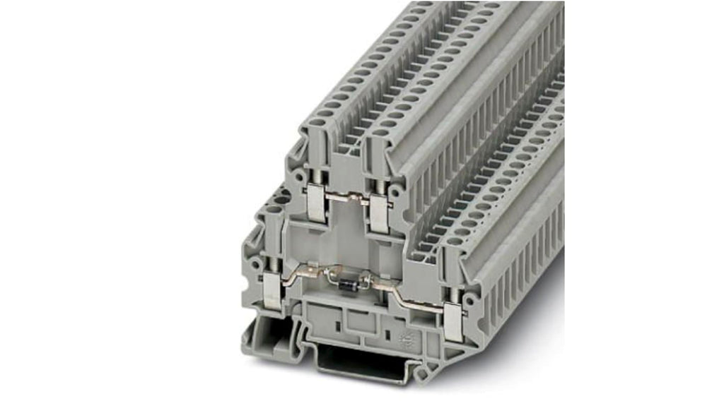 Morsettiera per guida DIN, livello doppio, corrente nominale 28A, tensione nominale 500 V, terminazione a vite, colore grigio, serie TB, modello UTTB 2.5-DIO/UL-UR, compatibile con cavi AWG 26 a 12.