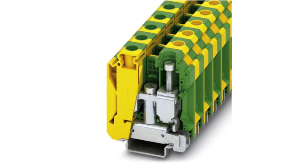 Morsettiera per guida DIN, terminali modulari di massa, colore verde-giallo, livello singolo, metodo di connessione a vite, numero di collegamenti 2, sezione cavo 10 mm² - 35 mm², AWG 8 - 2, corrente nominale 125A, larghezza 16 mm, tipo di montaggio NS 35/7,5 e NS 35/15, temperatura operativa da -60°C a +130°C. Codice costruttore 3074143, marchio Phoenix Contact.