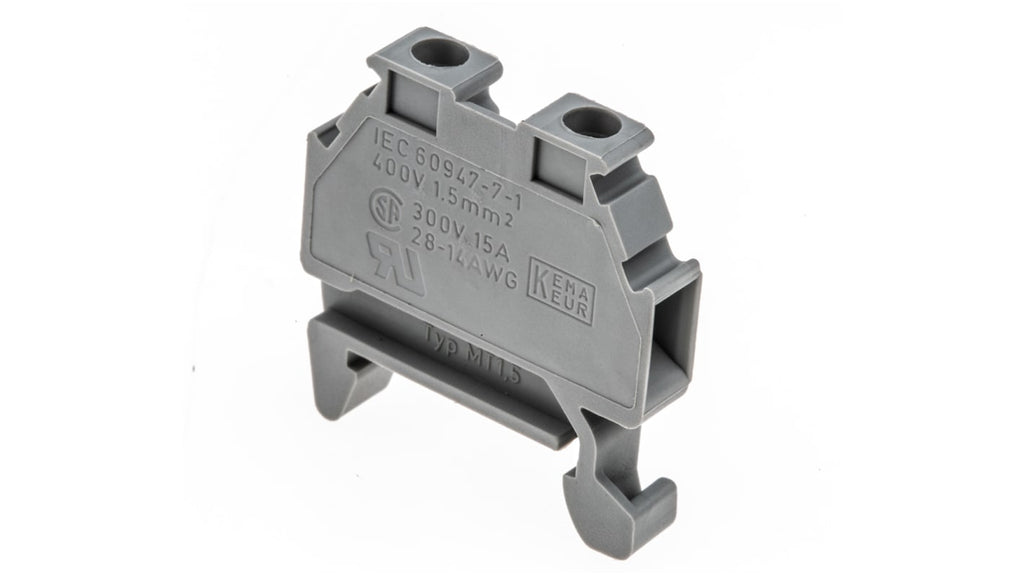 Morsettiera per guida DIN, Phoenix Contact, grigio, livello singolo, corrente nominale 17,5 A, tensione nominale 400 V, compatibile con cavi da 26 a 16 AWG, terminazione a vite, dimensioni 4,2 mm di larghezza, temperatura operativa da -5 a +70 gradi Celsius, standard CSA, cULus, DNV, EAC, installazione senza utensili su guida DIN da 15 mm.