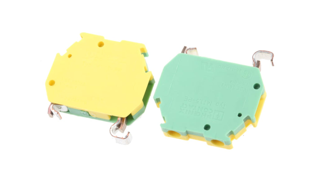 Morsettiera di terra, 2 vie, 26 a 16 AWG, tipo MT1.5 -PE, marchio Phoenix Contact. Dimensioni: lunghezza 22 mm, larghezza 4.2 mm, altezza 23.5 mm. Materiale custodia in poliammide. Massima temperatura operativa +130 gradi Celsius, minima temperatura operativa -60 gradi Celsius. Terminazione avvitare. Montaggio su TS15 RS 467-349. Terminali compatti per commutazione in spazi ristretti.