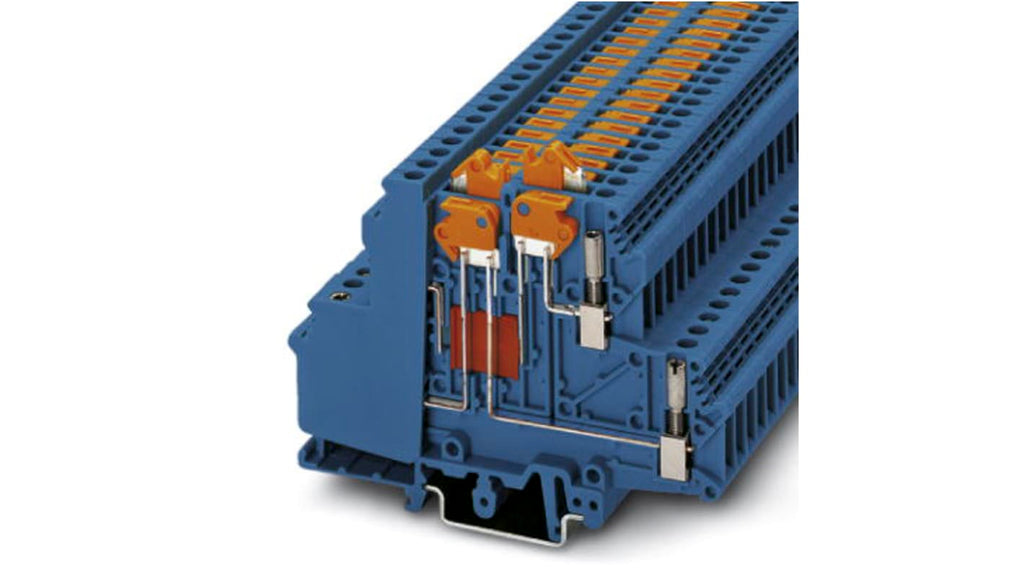 Contatto standard a blocchi, terminale di scollegamento coltelli, colore blu, livello doppio, tensione nominale 400 V, corrente nominale 10 A, metodo di connessione a vite, sezione cavo 0,2 mm² - 4 mm², AWG 24 - 12, dimensioni 93 mm x 6,2 mm, montaggio su guide NS 35/7,5, NS 35/15, NS 32. Codice costruttore 3101113, marchio Phoenix Contact.