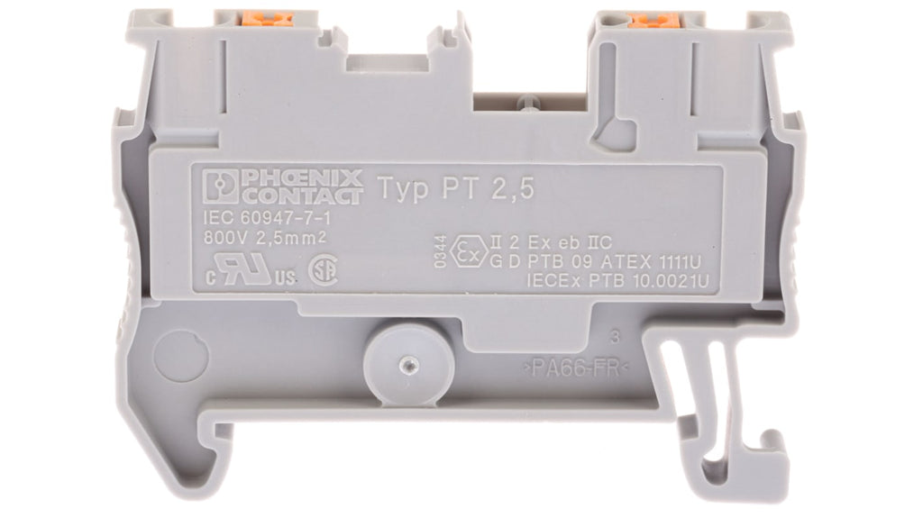 Morsettiera passante Phoenix Contact, colore grigio, livello singolo, corrente nominale 24A, tensione nominale 800V, compatibile con cavi da 26 a 12AWG, terminazione a innesto, intervallo di temperatura operativa da -60 a +105 gradi Celsius, contenitore in PA, resistenza agli urti 18 ms, certificazioni ATEX, CCC, CSA, cULus, EAC Ex, IECEx, UL, modello PT 2,5.