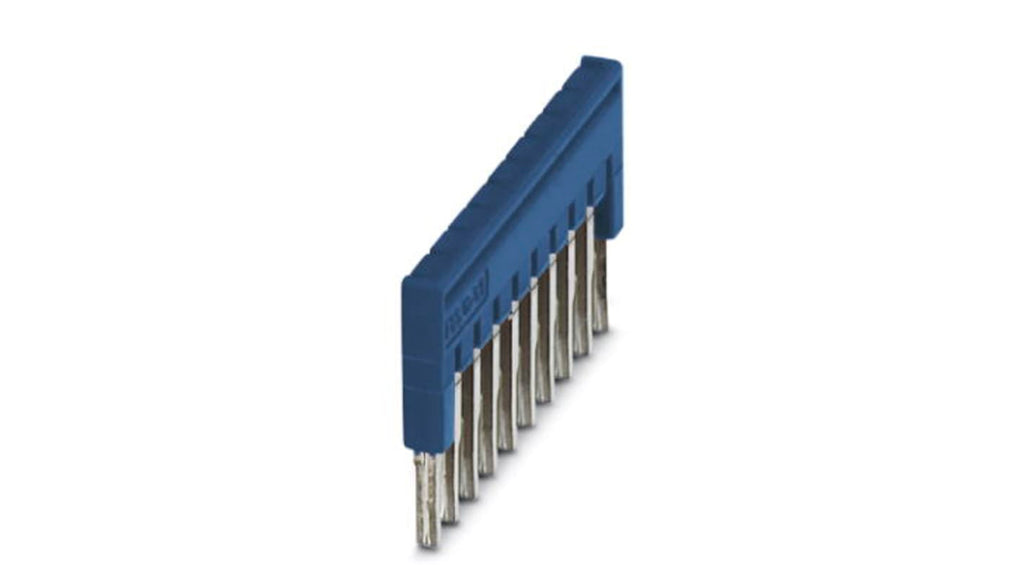 Barra a ponticello per morsettiera, passo 3,5 mm, 10 posizioni, montaggio a innesto, corrente massima 17,5 A, ampia gamma di temperatura da -60 a +105 gradi, struttura in rame, alloggiamento blu, peso 3,41 g, grado di infiammabilità UL94 V0, isolamento in poliammide, tagliabile per assemblaggio flessibile.