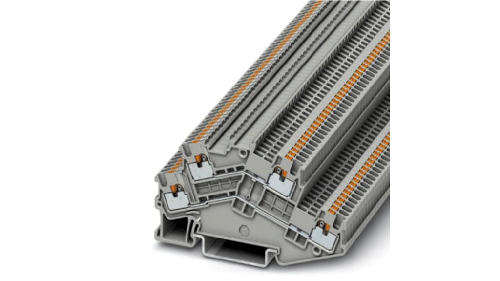 Morsettiera a due livelli Phoenix Contact, design compatto, colore grigio, corrente nominale 16A, tensione nominale 500 V, terminazione a inserzione, compatibile con AWG 26 a 14, aree di etichettatura integrate, etichettatura opzionale di grandi dimensioni, modello PTTBS 1.5/S. Collega i livelli ai ponticelli FBS-PV. Codice costruttore 3214657.