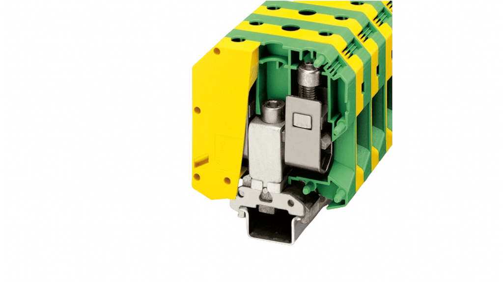Morsettiera di terra Phoenix Contact, verde/giallo, livello singolo, corrente nominale 232A, terminazione a vite, serie USLKG. Adatta per cavi da 25 a 95 mm², operativa da -60 a +110 gradi Celsius, certificata ATEX, UL, CUL, CSA. Design compatibile con morsetti UK, ideale per applicazioni industriali e sistemi di automazione.