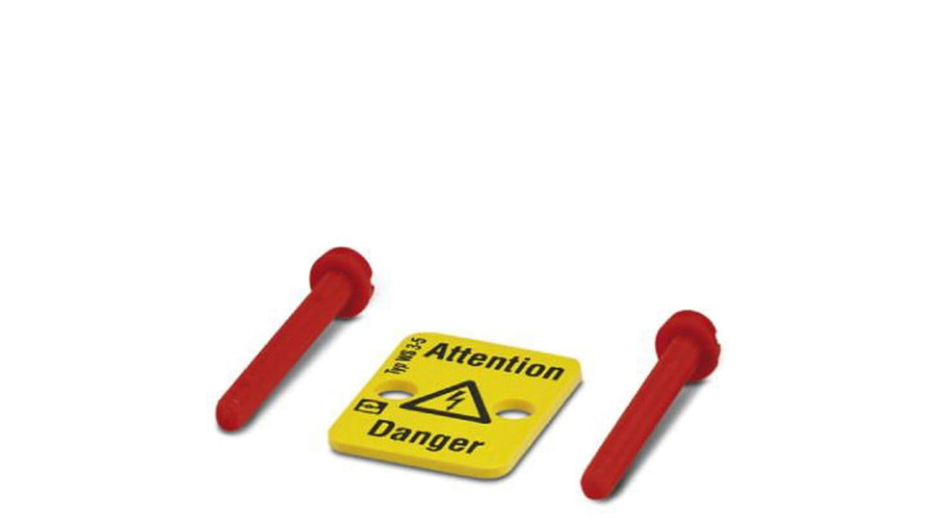 Etichetta di avvertimento. Piastra di avvertimento con 2 viti in plastica, su 3 terminal, passo 5 mm. Fissaggio negli alberi a ponte delle terminal modulari del Regno Unito. Accessorio per segnalazione di avvertimenti. Marchio Phoenix Contact, codice costruttore 805357.