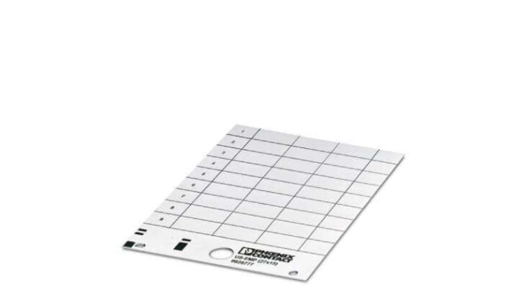 Segnacavi a inserimento Phoenix Contact, codice costruttore 828777, per utilizzo con BLUEMARK ID, BLUEMARK ID COLOR, THERMOMARK CARD, THERMOMARK CARD 2.0, THERMOMARK PRIME. Montaggio a scatto, colore bianco, rigidità della pellicola 500 μm, 27 targhette singole, 3 targhette singole per fila. Serie US-EMP (27X15). Accessorio per identificazione cavi.