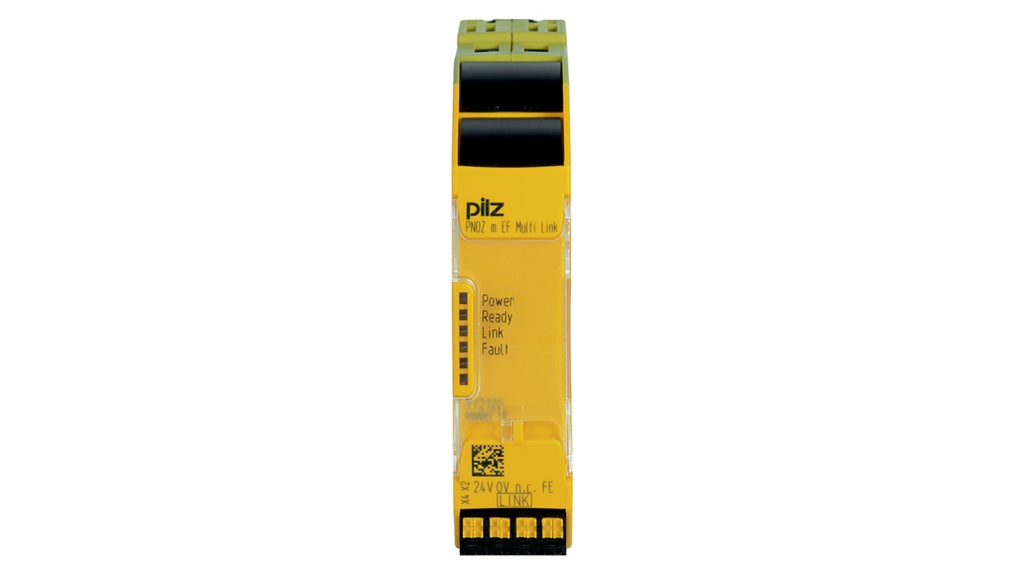 Modulo di collegamento per PNOZmulti 2, consente il collegamento sicuro di due unità base, alimentazione 24 V c.c., montaggio su guida DIN, dimensioni 101,4 x 22,5 x 120 mm, collegamento point-to-point con cavo a coppia intrecciata e schermato a 4 conduttori, 32 ingressi virtuali e 32 uscite virtuali, indicatori LED per stato di funzionamento e errori, certificazioni CE, cULus, TÜV, BG, CCC.