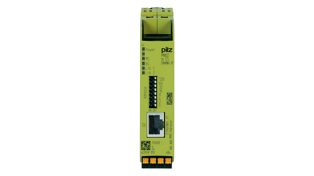 Modulo di comunicazione EtherNet/IP per sistema di controllo PNOZmulti 2, tensione di alimentazione 24 V c.c., montaggio su guida DIN, dimensioni 101,4 x 22,5 x 110,4 mm. Supporta velocità di trasmissione 10 Mbps e 100 Mbps, 128 ingressi e uscite virtuali, interruttore a 2 porte, DLR, server web integrato. Certificazioni CE, cULus, TÜV, BG, CCC. Fornito con morsetti a vite.