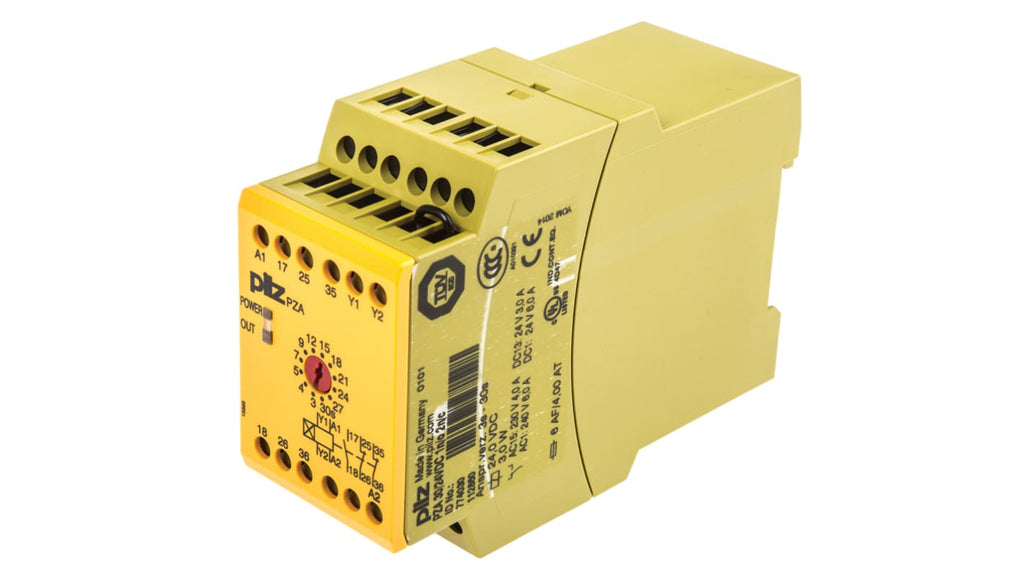 Relè di sicurezza per guida DIN, tensione di alimentazione 24V cc, 1 canale, 1 contatto di sicurezza, 2 contatti ausiliari N/C, monitor a prova di guasto, interruzione di emergenza con ritardo allo sgancio selezionabile in 12 passi (3-30 sec), dimensioni 121mm x 45mm x 87mm, standard VDE 0113, EN 60204-1, EN 1088, IEC 204-1.